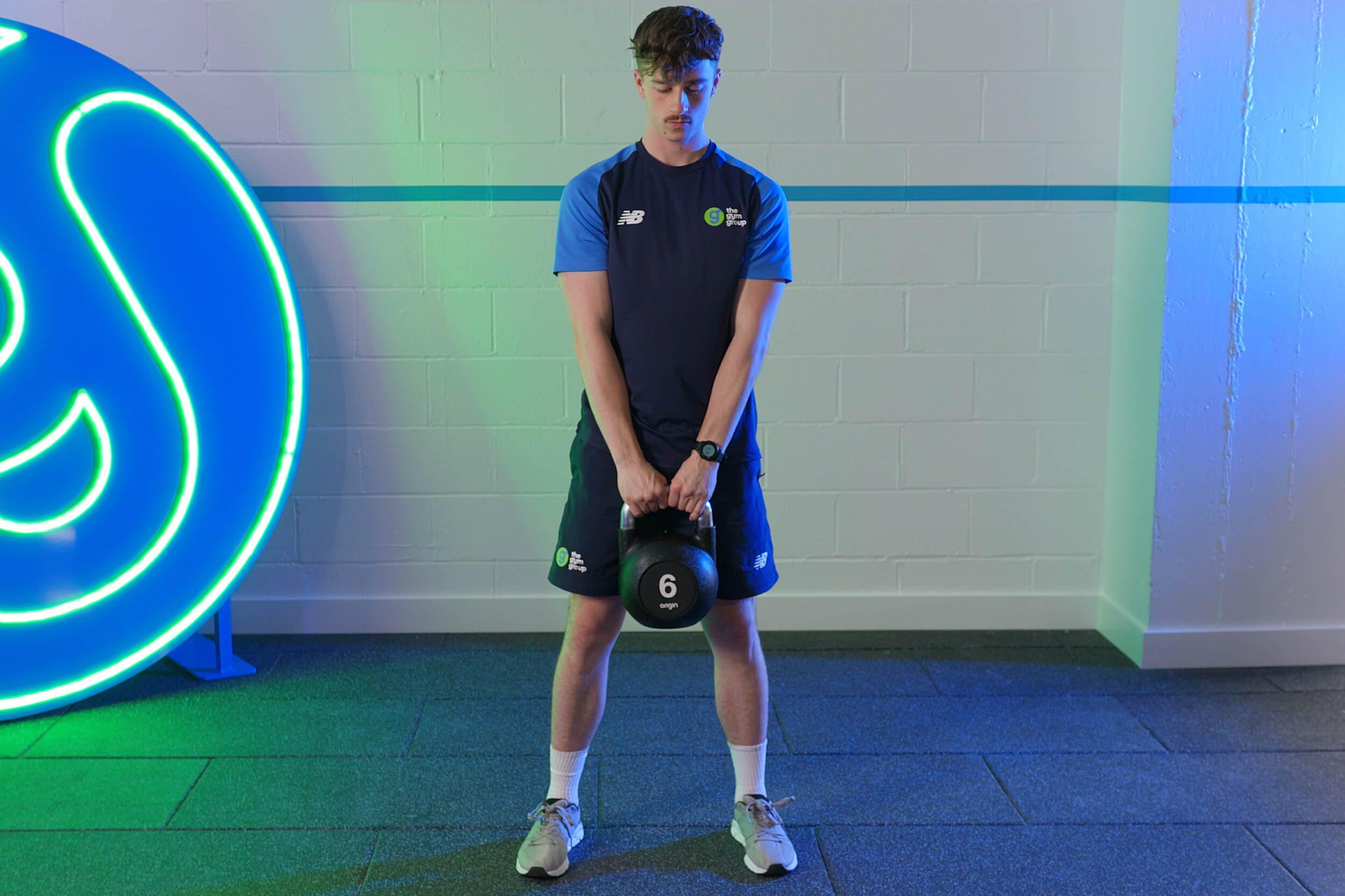Stand with your feet shoulder width apart, with the kettlebell hanging down in front of you. You should grip the handle with both hands.